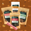 No tricks, just tail-wagging treats! This month's Trick for Treat Halloween bundle is packed with spooky-good, all-natural dog treats that your pup will love sinking their teeth into. Whether they’ve mastered a spooky spin or a creepy crawl, reward their best tricks with this value packed mix of festive flavours.